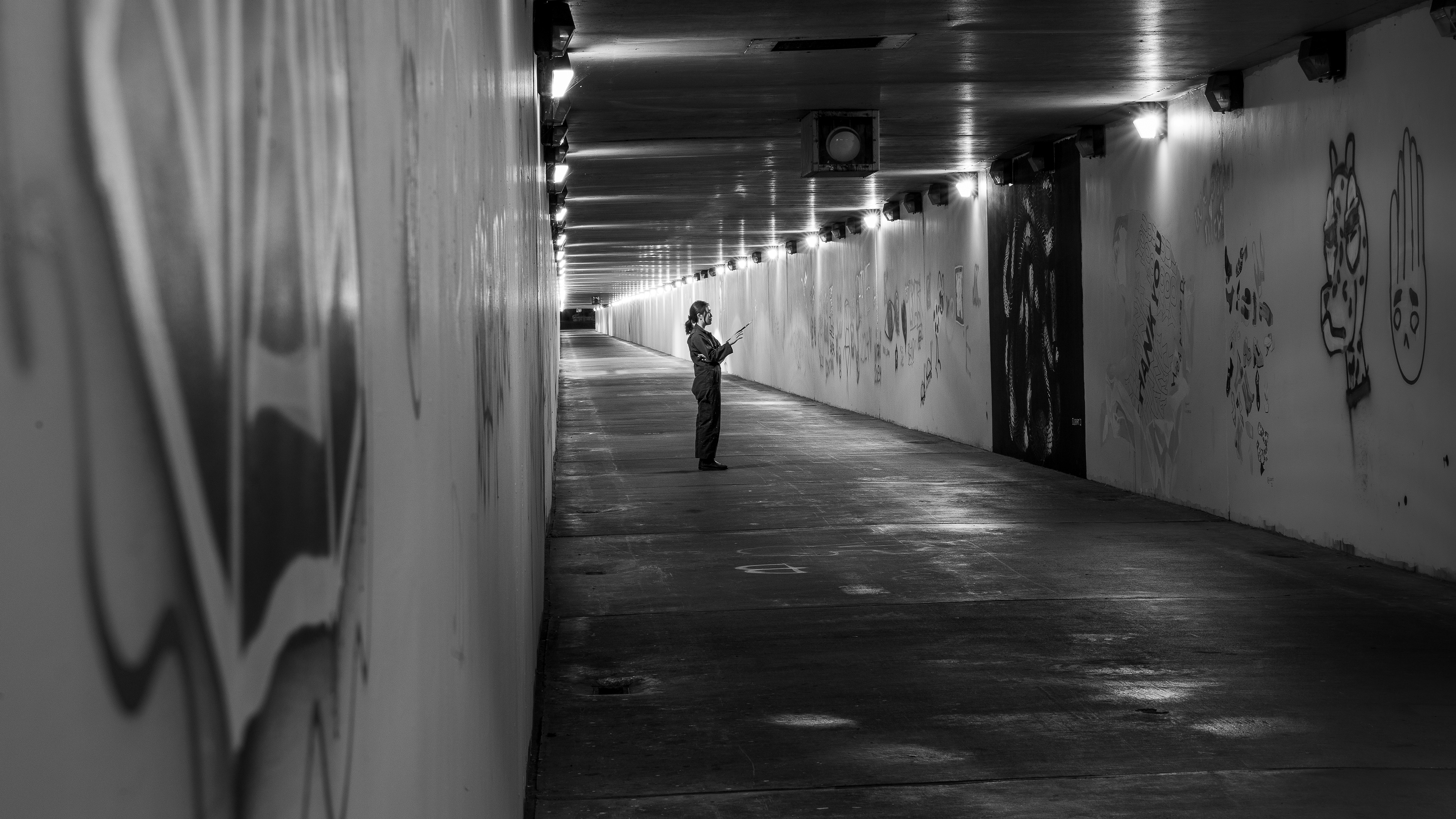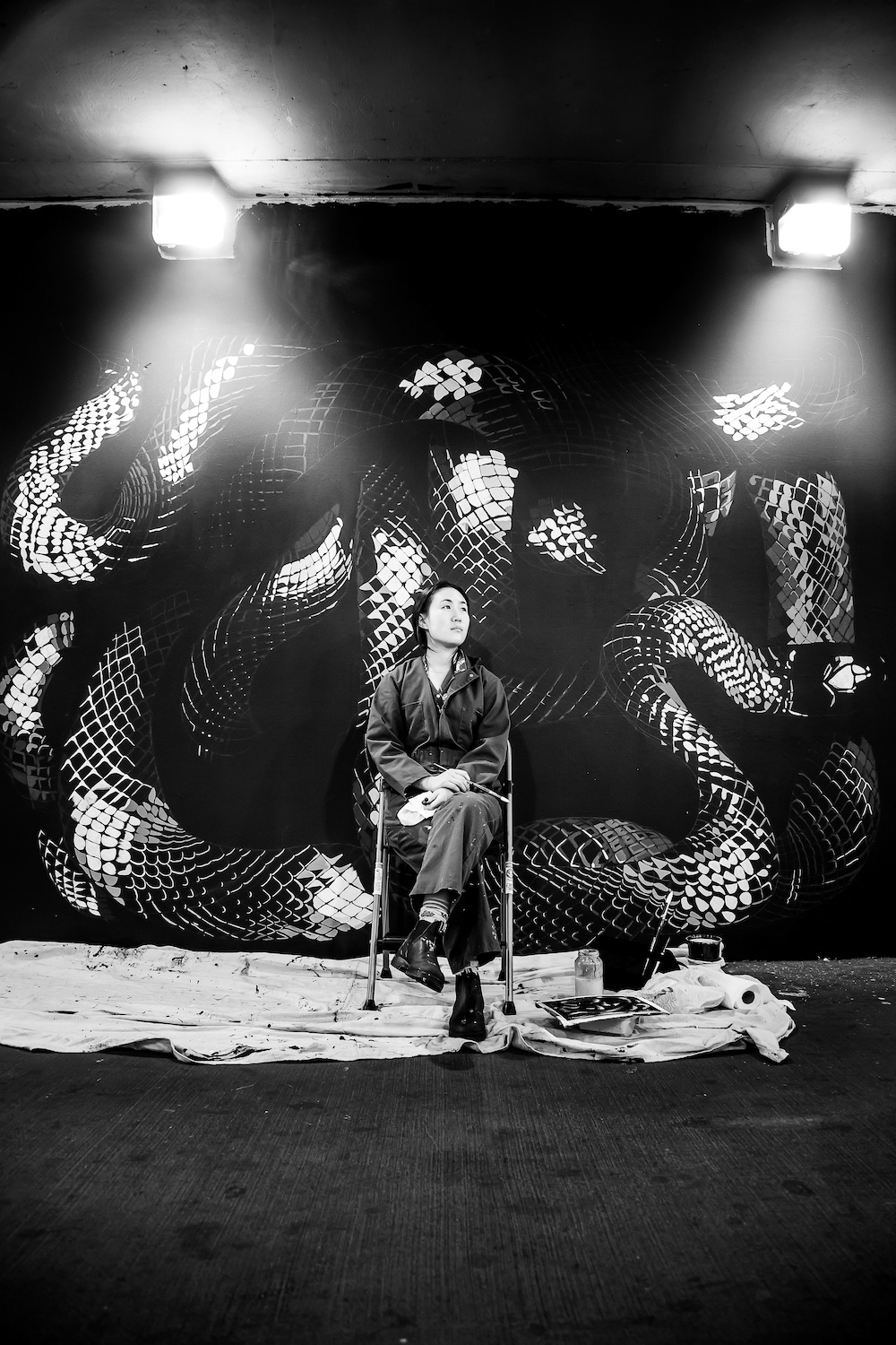 11'x9'. This black-and-white mural references a photograph by Guido Mocafico.